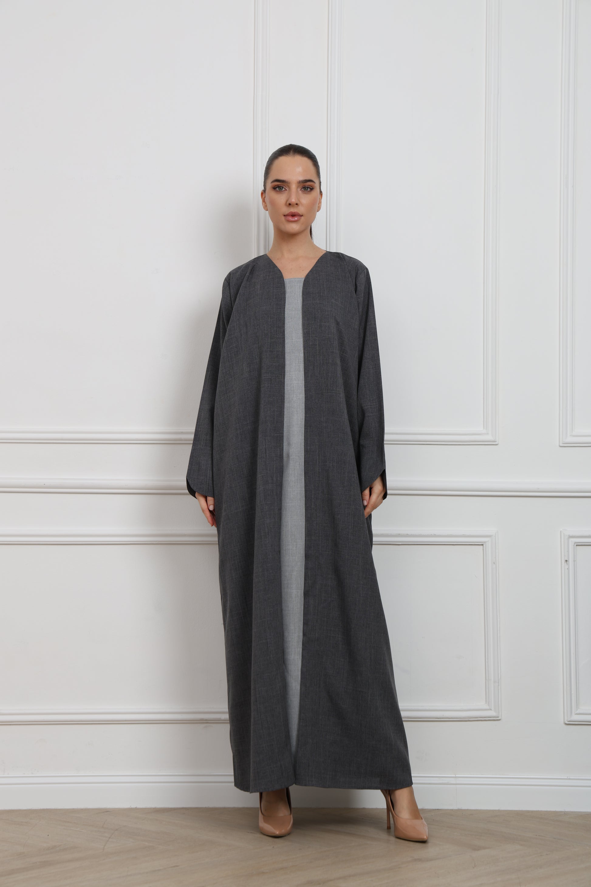 يعلوه عباية خارجية بلون رمادي غامق بقصة فضفاضة وانسيابية، تمنحك حضور راقٍ بدون مبالغة.